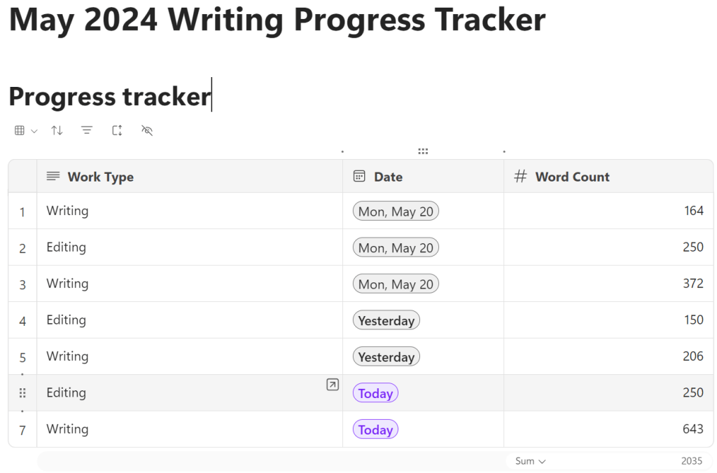 Microsoft Office has a relatively new program called Loop where I’m keeping track of my word count. It has a pretty snazzy desktop and mobile app interface. I am also keeping track of my daily writing habit on an Excel sheet along with a few other habits. Yes, I am in fact a nerd.